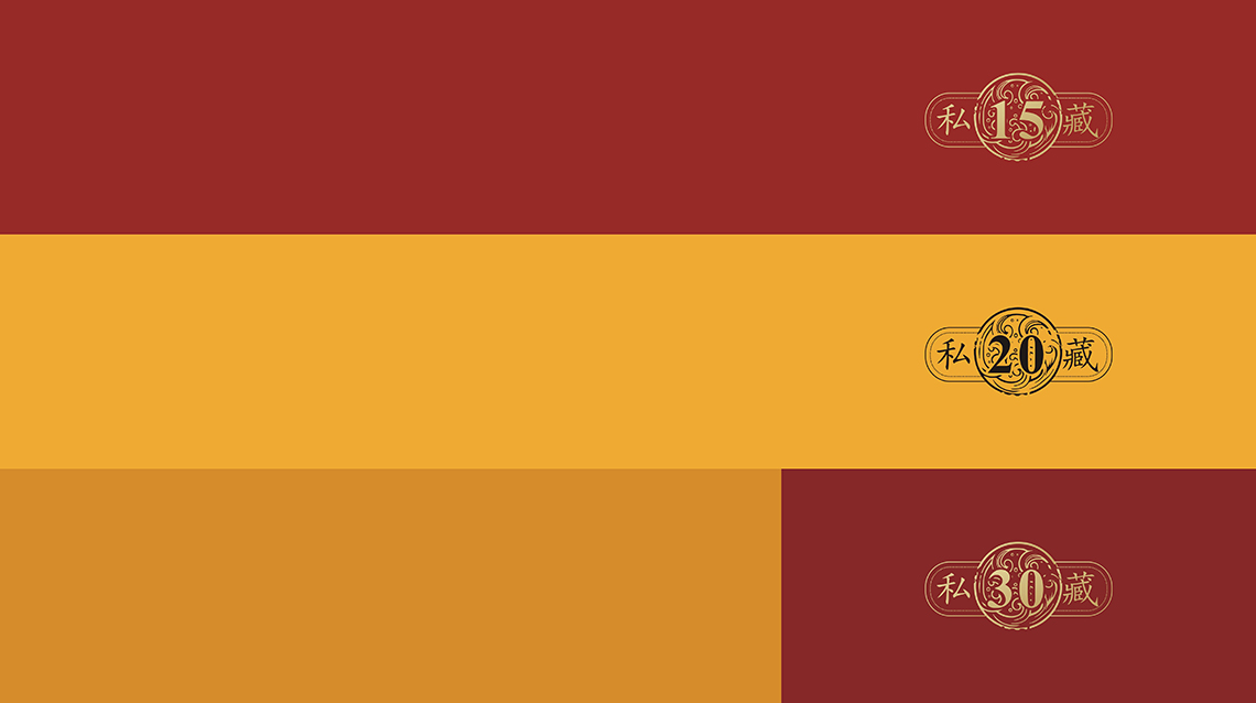 赖室老酒·私藏15、私藏20、私藏30分别采用传统“绛红色”、“帝王黄”、“ 绛红&帝黄”作为主色,